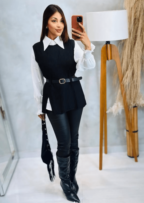 Transforme seu visual com este conjunto sofisticado composto por camisa branca e colete canelado.