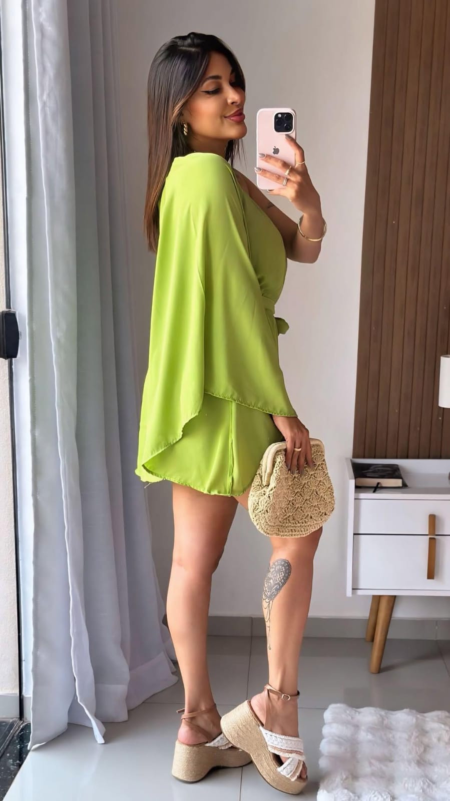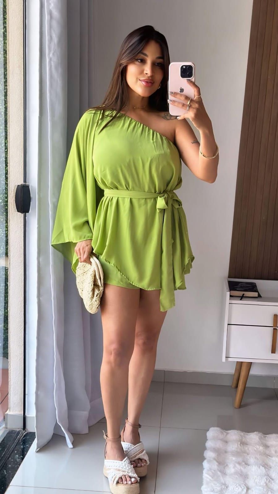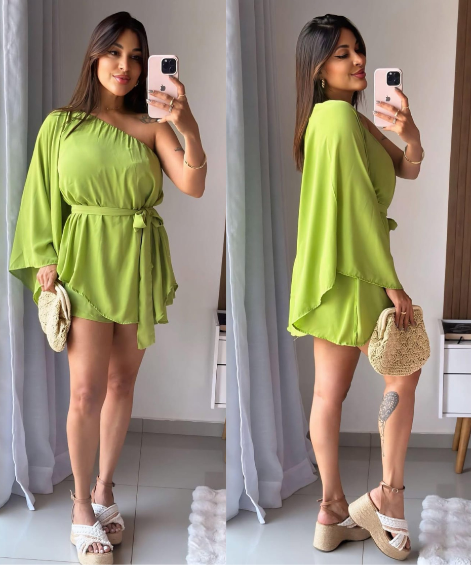 O Macaquinho One Shoulder Green Glam é a escolha ideal para quem quer um visual moderno, leve e com toque de sofisticação. Com modelagem assimétrica de um ombro só e manga ampla fluida, ele traz movimento e elegância em cada detalhe. A faixa para amarração na cintura permite ajustar o caimento, valorizando a silhueta com charme e conforto.
