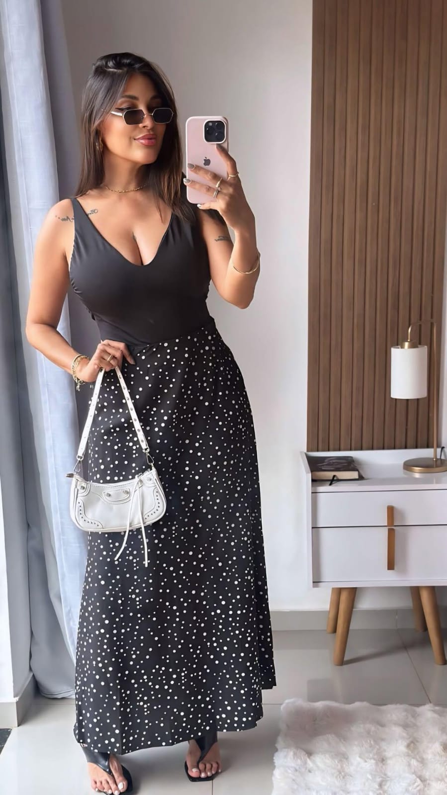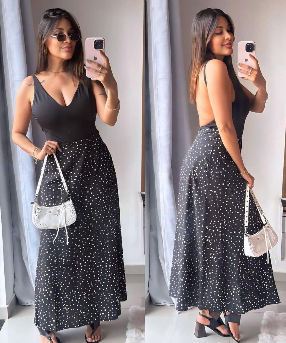 A Saia Midi Cetim Poá Isabela é pura elegância e estilo! Confeccionada em tecido acetinado de toque leve e caimento fluido, ela traz o charme atemporal da estampa de poá — moderna, delicada e sempre em alta.