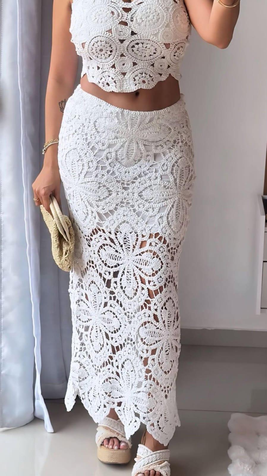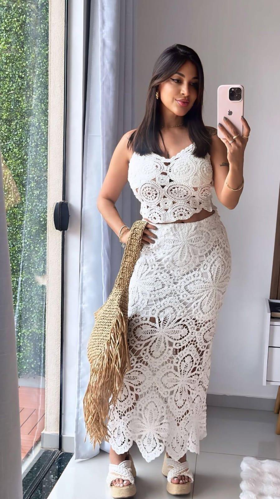 A Saia Midi Encanto em Renda Artesanal é a tradução da elegância leve e feminina. Feita com renda trabalhada em detalhes florais, ela tem caimento impecável e toque delicado, valorizando a silhueta com sofisticação. O modelo midi traz transparência na medida certa e acabamento refinado, perfeito para compor looks elegantes e modernos.