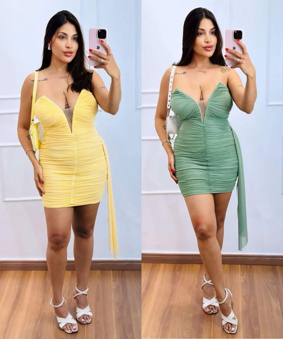 O Vestido Curto Verde Drapeado com Decote Profundo é a escolha perfeita para quem deseja um look ousado, moderno e extremamente elegante. Com modelagem ajustada ao corpo, detalhe drapeado que valoriza as curvas e decote em tule transparente que traz sensualidade na medida certa, ele é ideal para festas, baladas e ocasiões especiais. O laço lateral dá um charme extra e sofisticação ao visual.