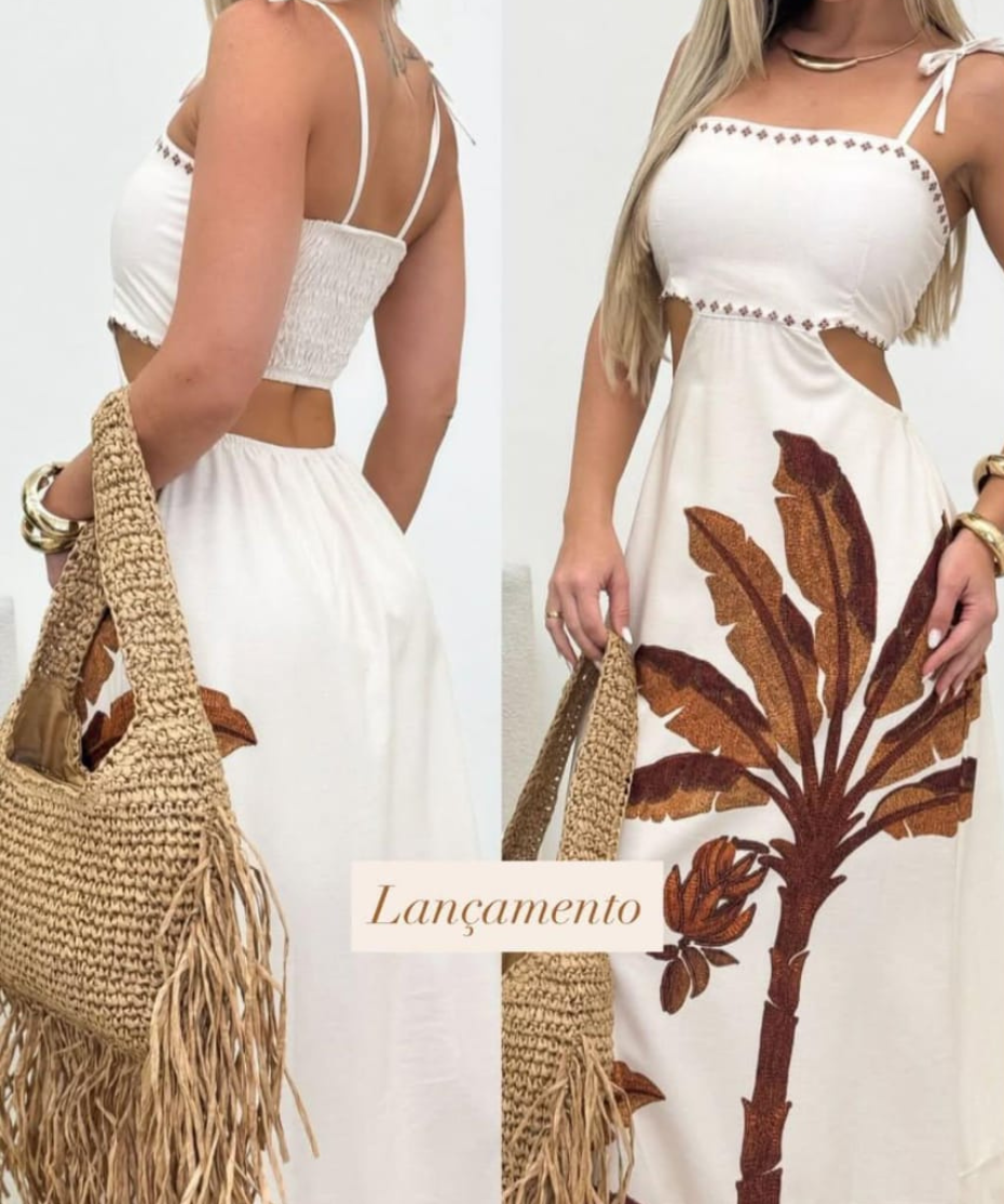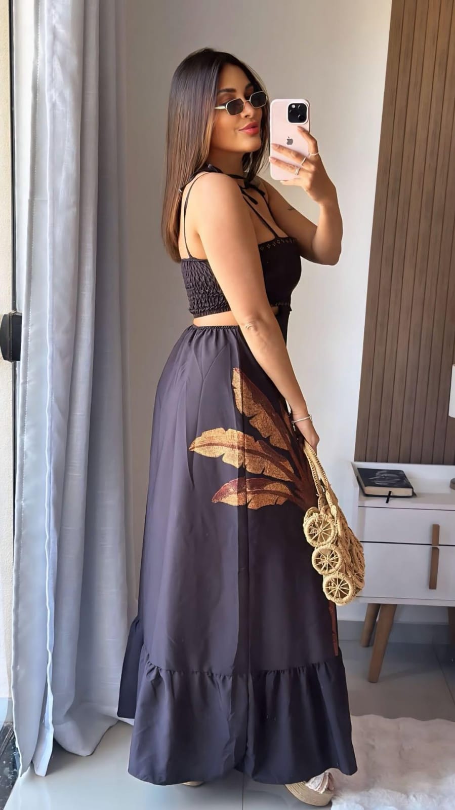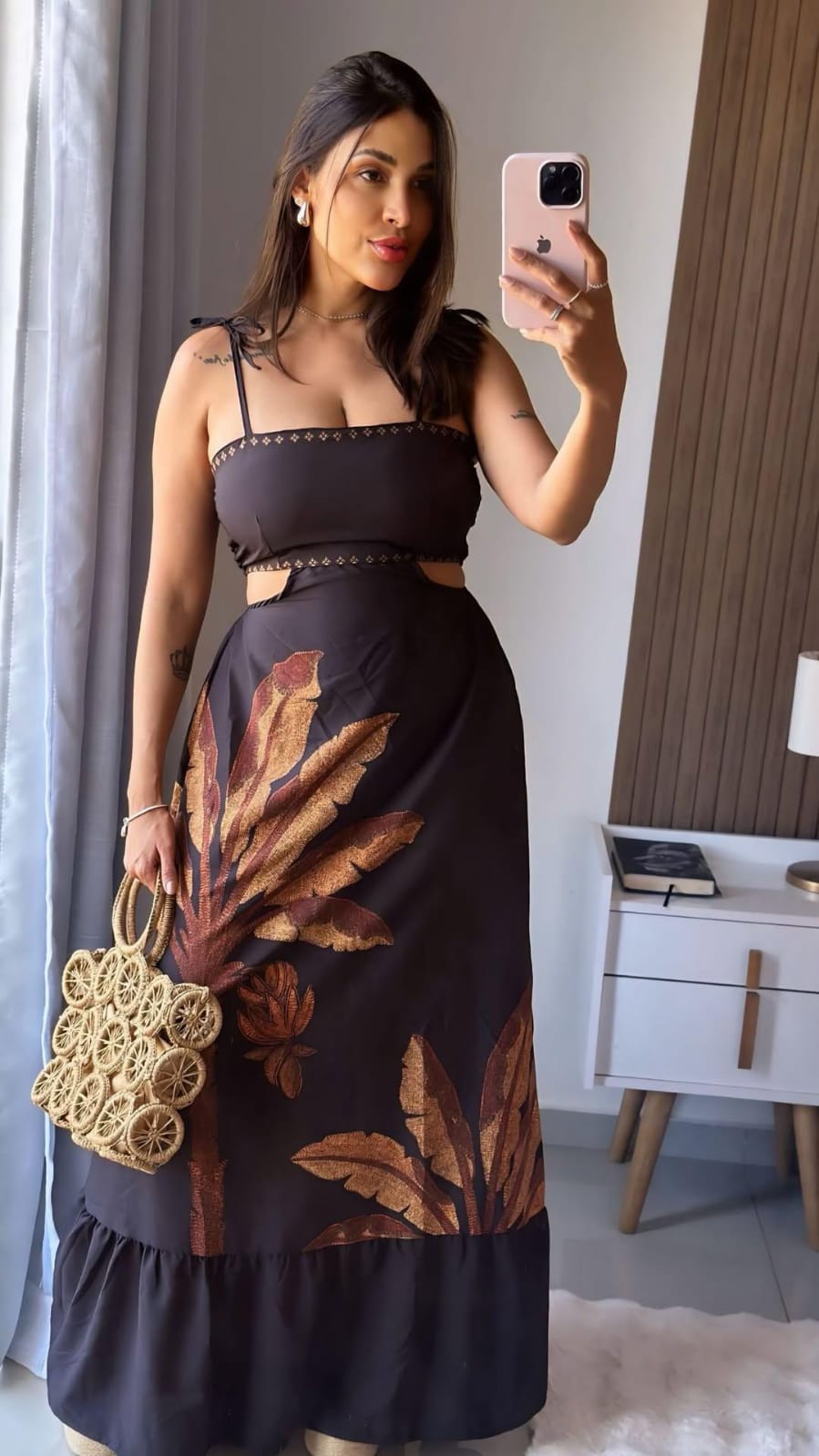 Vestido longo com modelagem elegante e fluida, confeccionado em tecido leve e confortável. Possui recortes laterais estratégicos que valorizam a silhueta, alças finas com amarração e detalhe de lastex nas costas, garantindo ajuste perfeito. A estampa de folhagem em tons terrosos traz um toque sofisticado e natural, ideal para composições estilosas tanto no dia a dia quanto em ocasiões especiais.