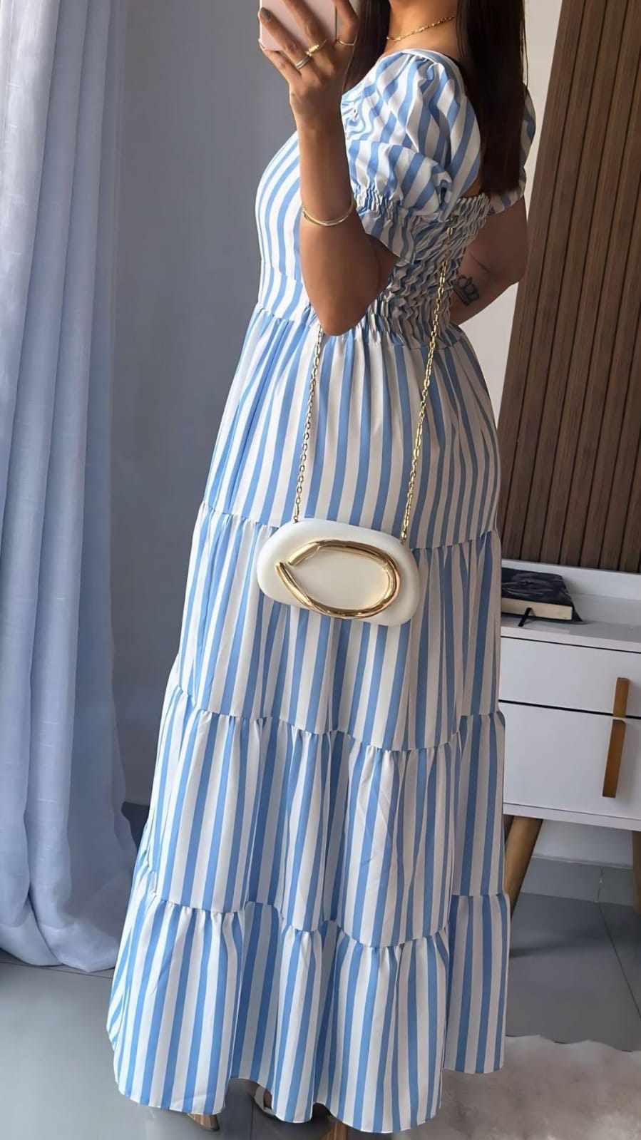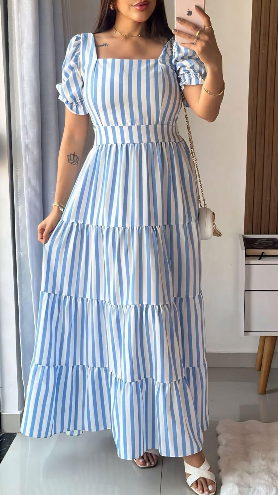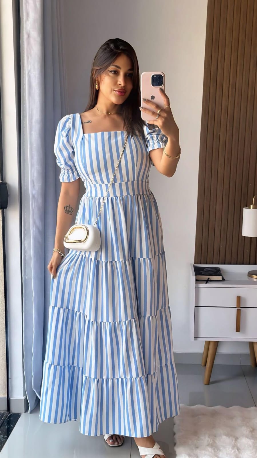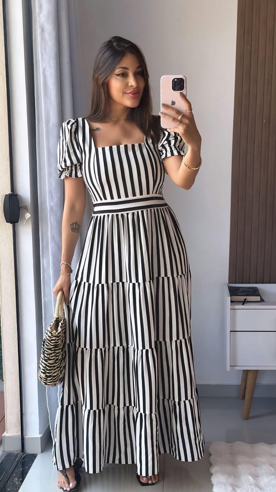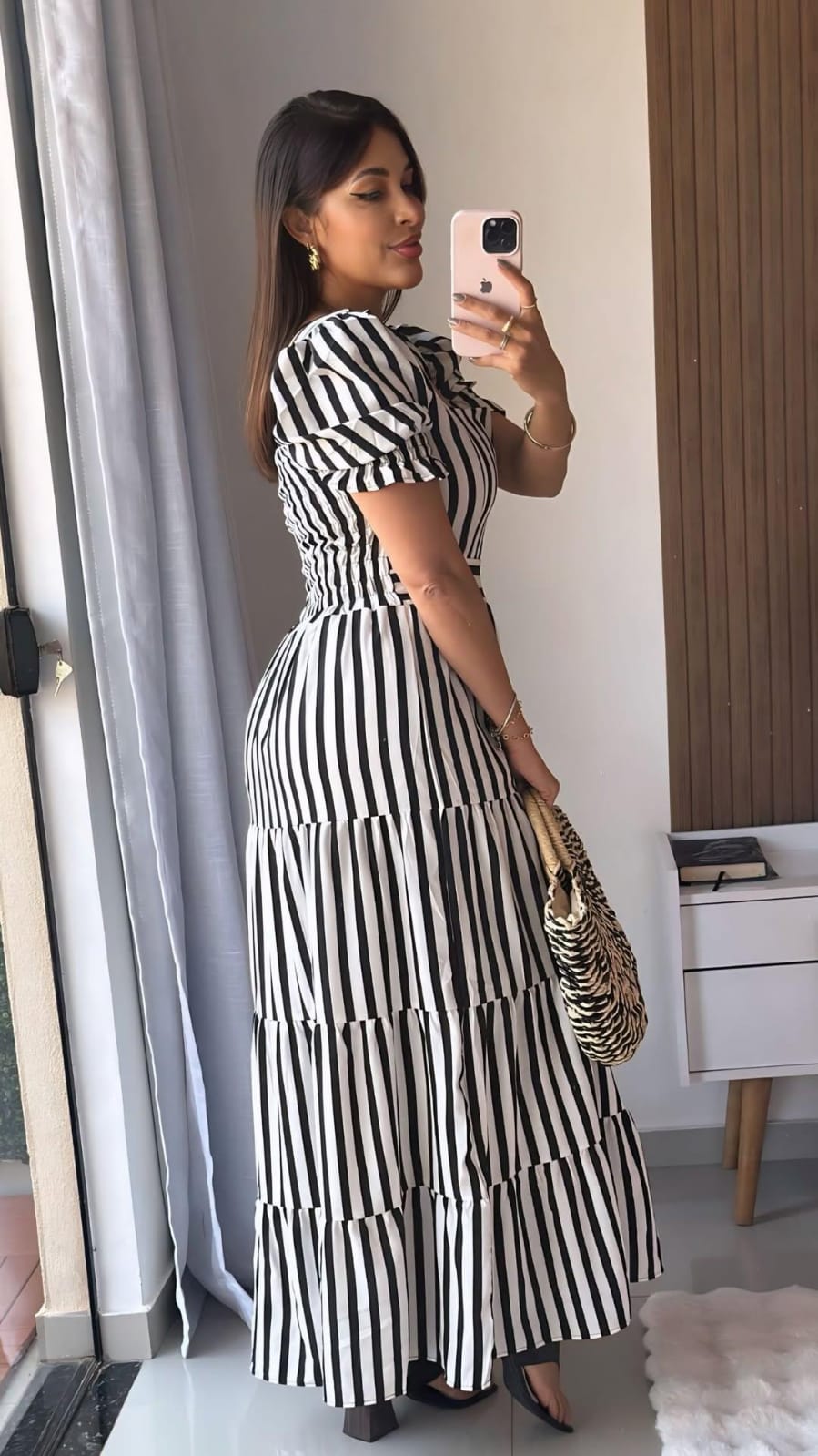 O Vestido Longo Listrado Juliete é a escolha perfeita para quem ama estilo, conforto e elegância no dia a dia. Com modelagem fluida e caimento impecável, ele valoriza a silhueta e traz um toque moderno com suas listras verticais — que alongam e afinam a forma do corpo.