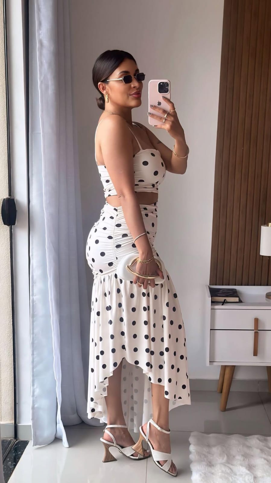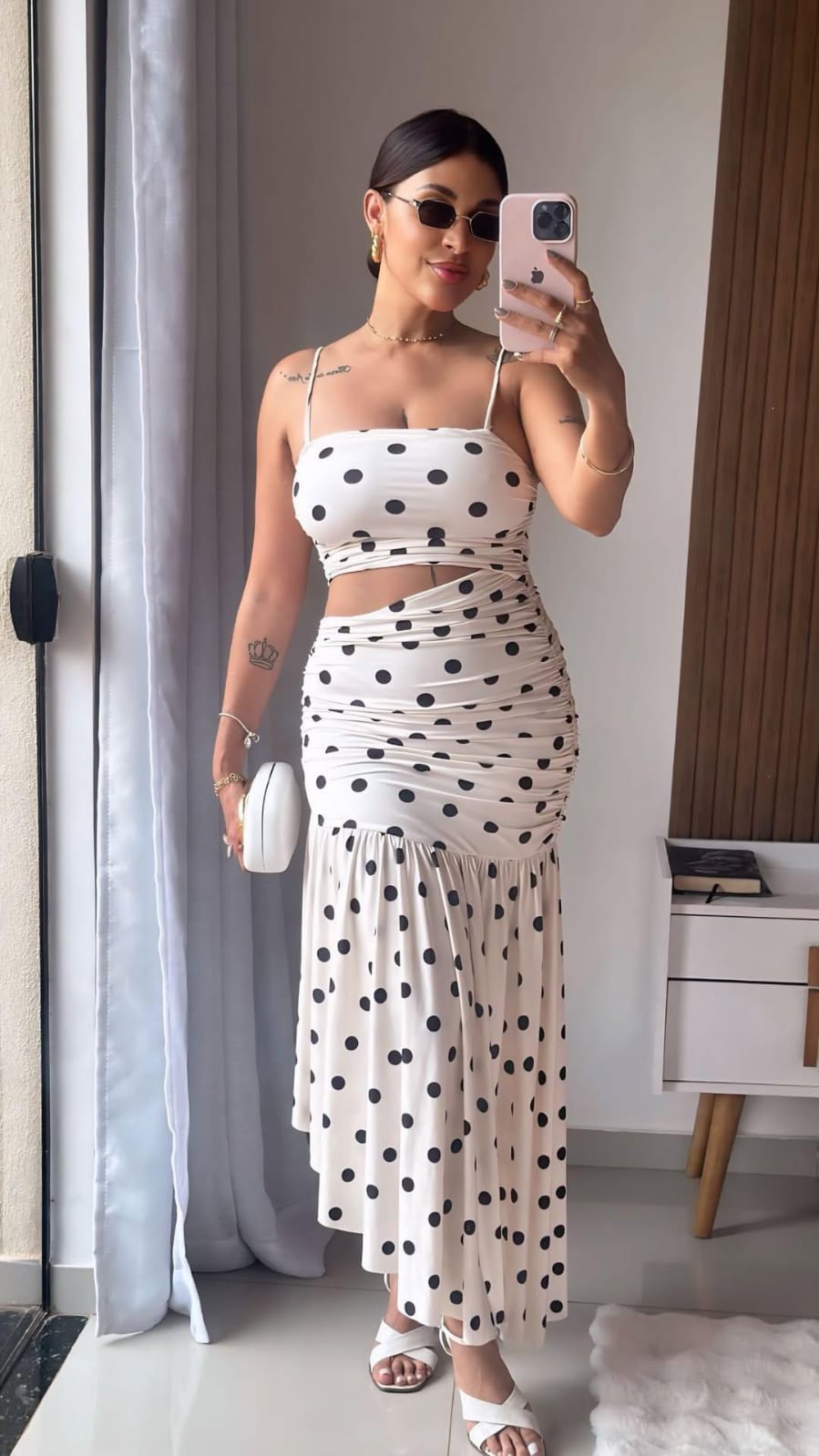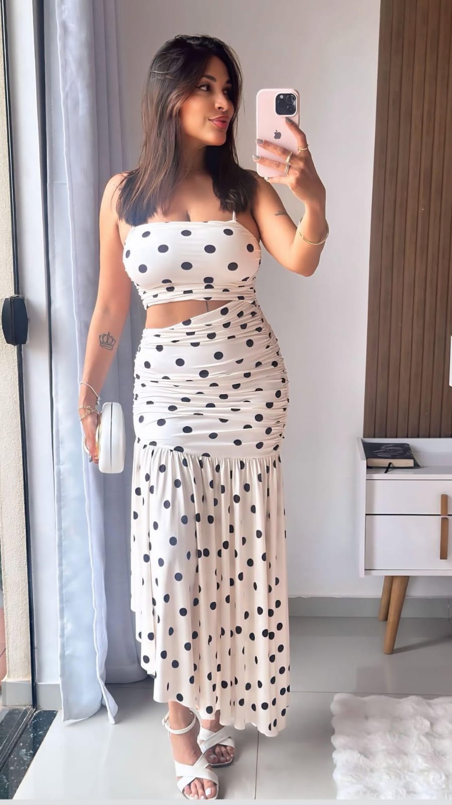 O Vestido Midi Poá Elegance é sinônimo de estilo e feminilidade. Com modelagem justa na parte superior e saia assimétrica com caimento leve, ele realça as curvas de forma elegante e sofisticada. A estampa clássica de poá traz aquele charme retrô que nunca sai de moda, enquanto os recortes estratégicos e franzidos laterais dão um toque moderno e sensual na medida certa.